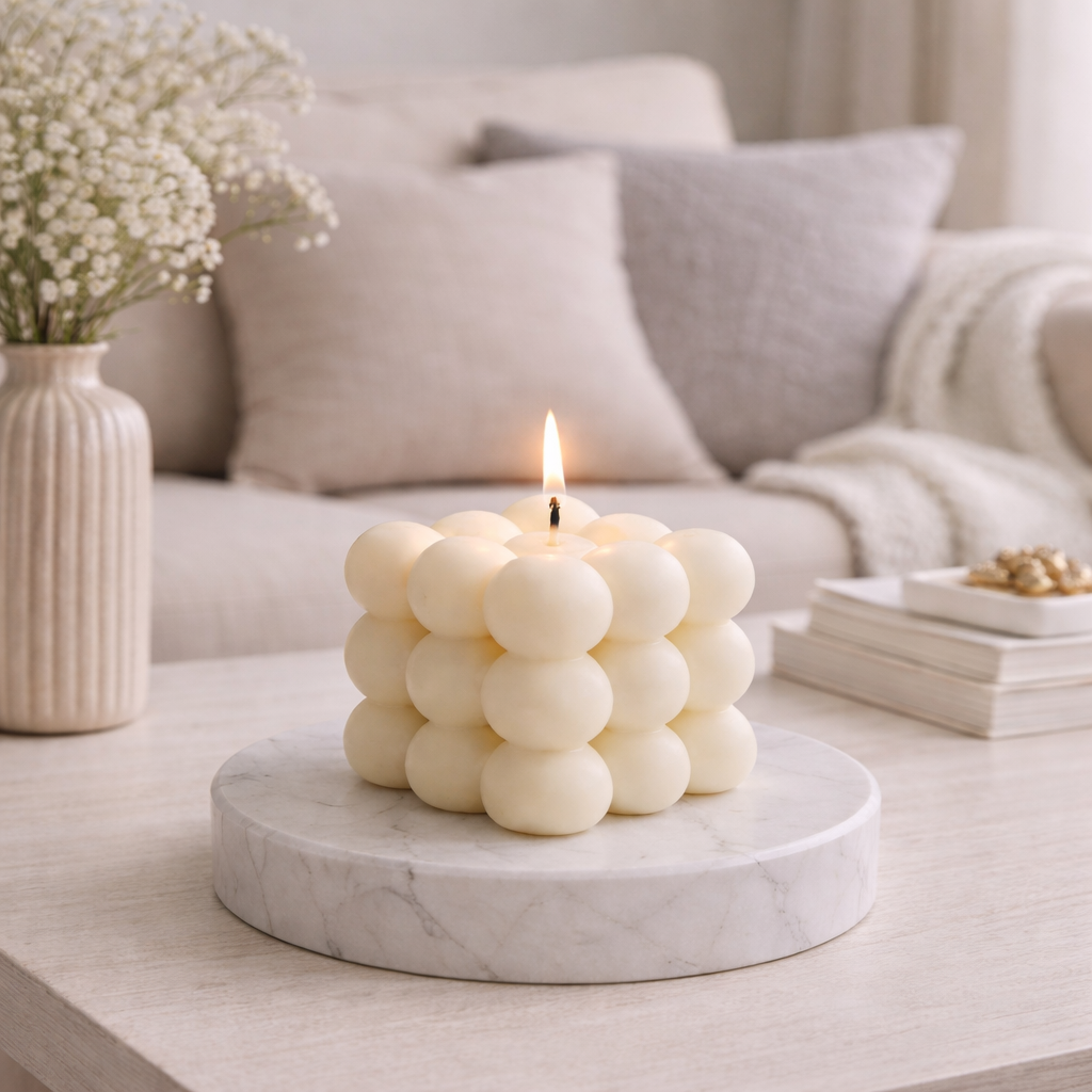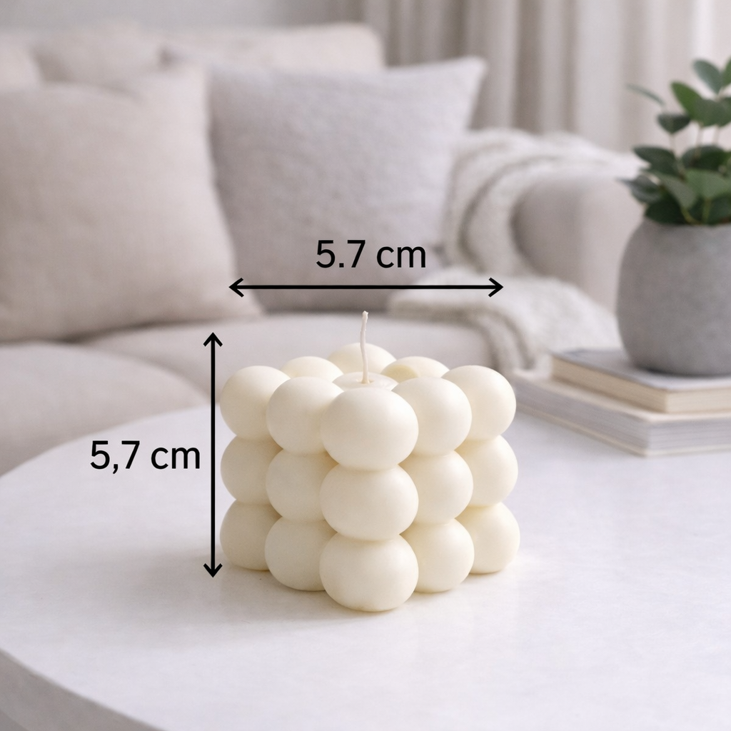 Bougie décorative en forme de cube a bulles, fabriquée artisanalement en France à partir de cire de soja végétale.